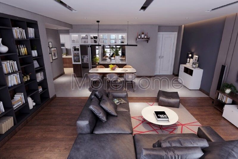 Với sự kết hợp giữa phòng khách hiện đại và đồ nội thất bọc da, thiết kế nội thất căn hộ chung cư được tạo nên với vẻ đẹp sang trọng và độc đáo.